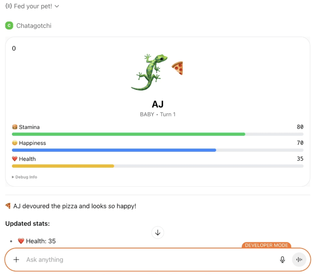A Chat session showing the pet’s state changing as you feed or play with it#### All UI interactions, loading screens, and game state are handled by: