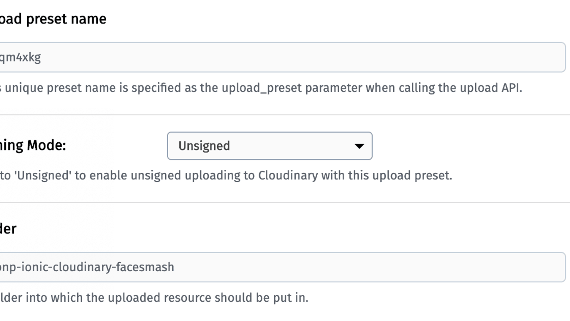 That preset places all the newly uploaded photos in a folder called ajonp-ionic-cloudinary-facesmash, as specified at the bottom of the settings screen:.