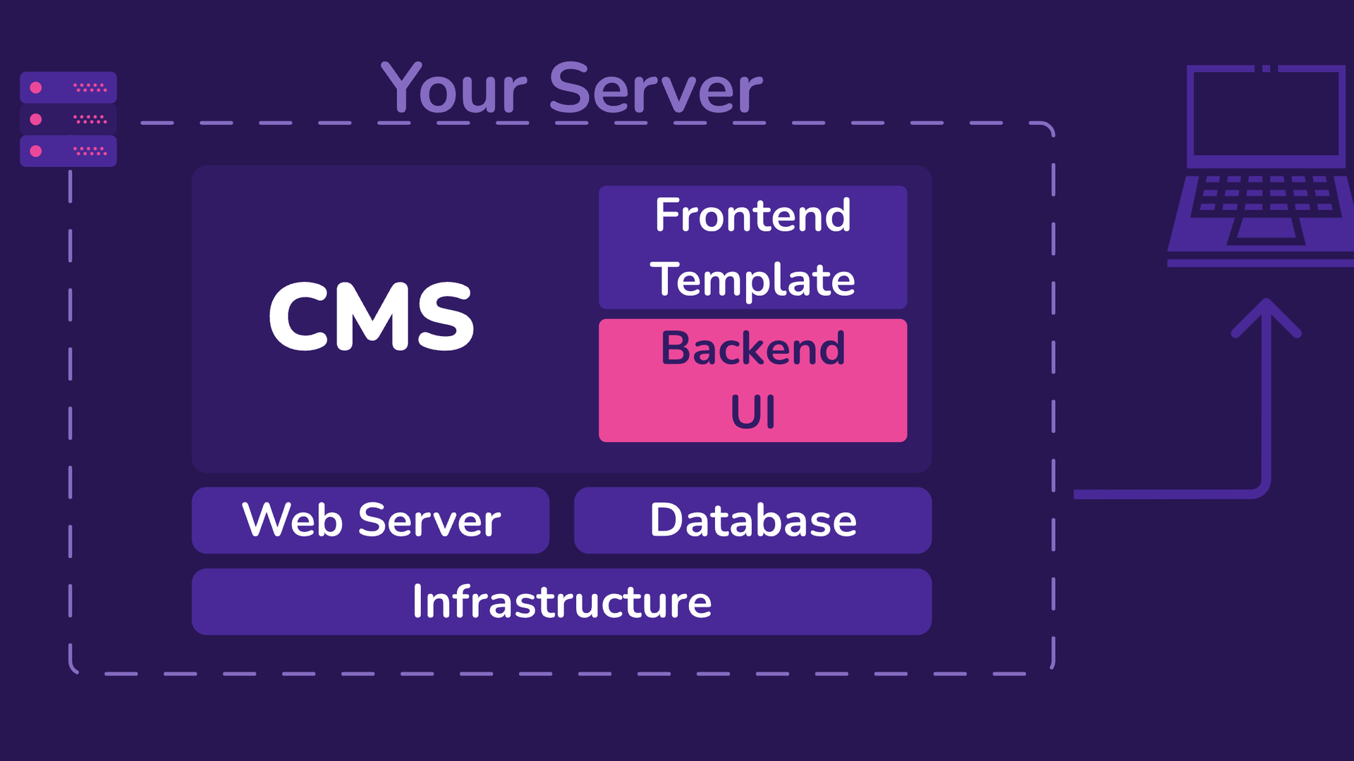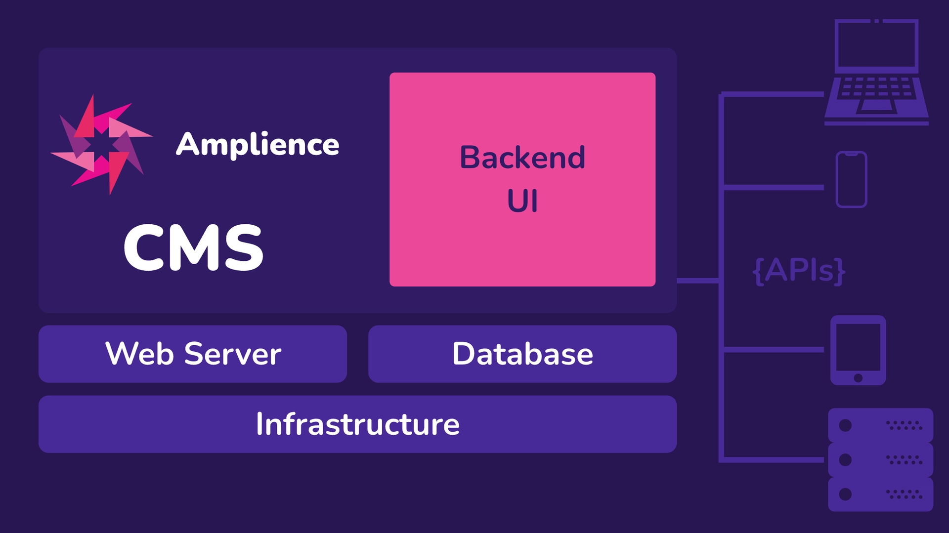 In the below illustration you can see three important differences from the Traditional CMS, the frontend template is removed, you no longer need to host your own server, and all devices are able to communicate via APIs to the CMS.