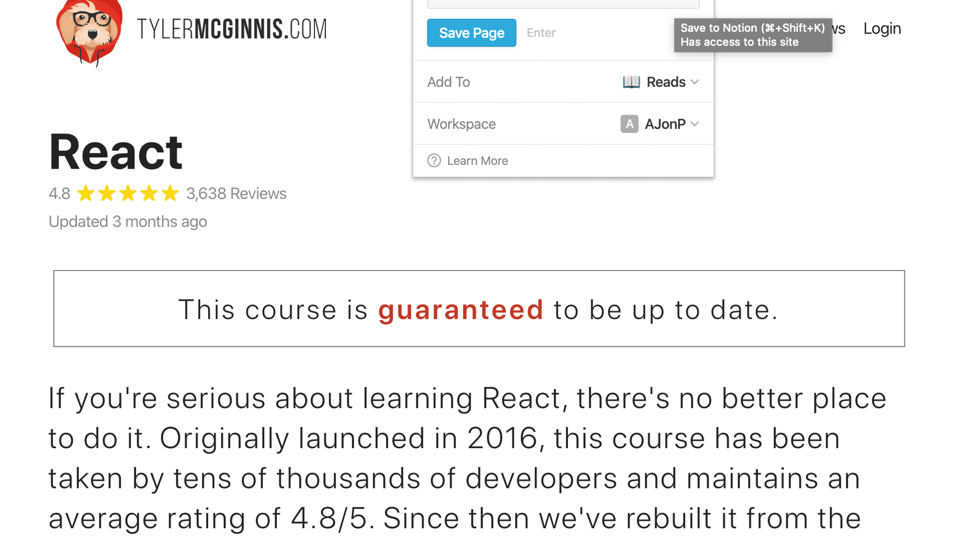One of my favorite features by far is the Notion Web Clipper which you can direct to any page type within your entire Notion system. So let's say that I am out on Tyler McGinnis's React Course and I want to keep track of it. All I have to do is be on the page and click the Notion Web Clipper, then load it directly into my Notion Reading List. After I can always see what I have not categorized and setup many views to keep track.