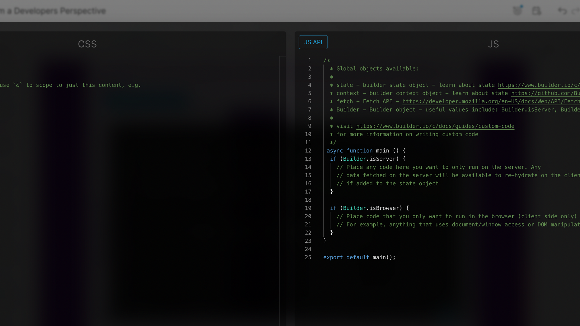 Something I forgot to mention was the fact this is not the only editor. Not only can you use components and bind dynamic data, there is also the capability to access global styling and JavaScript with a built in editor as well. In the image below you can see that you are also able to run JavaScript on the server via Builder.isServer as well as only on the client via Builder.isBrowser.